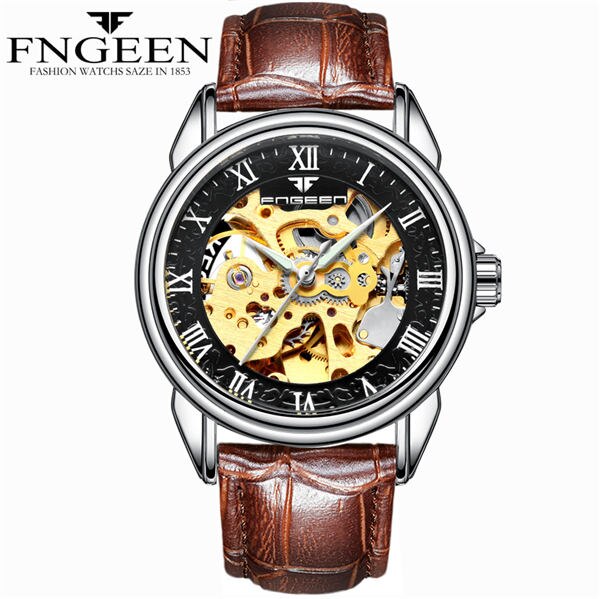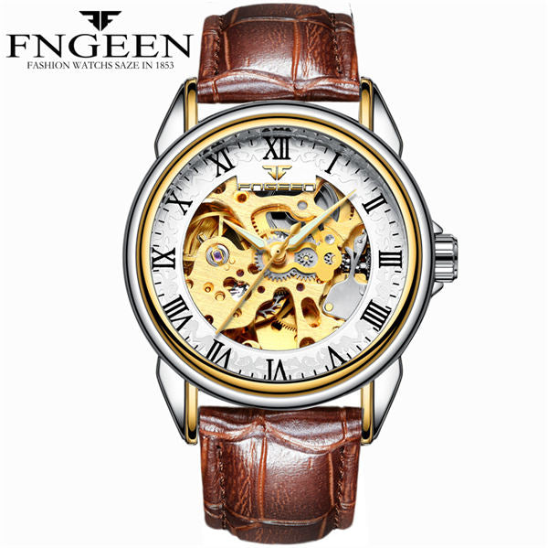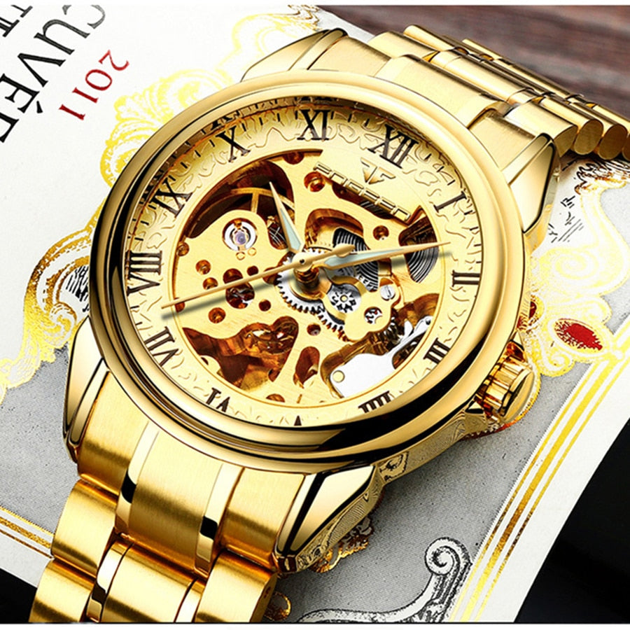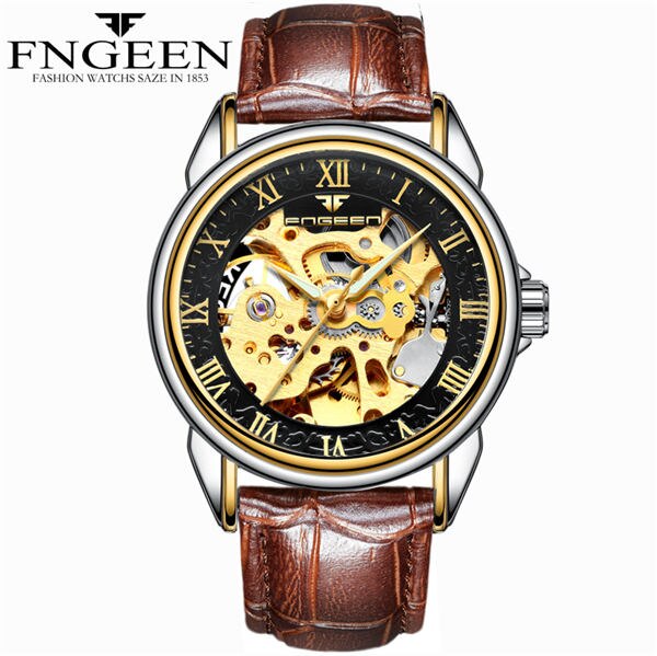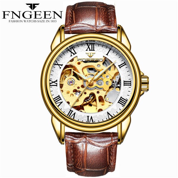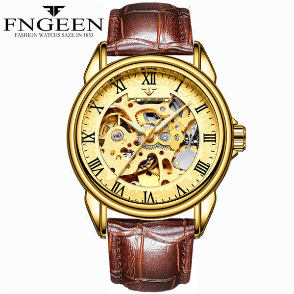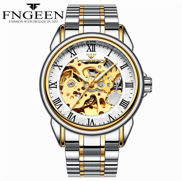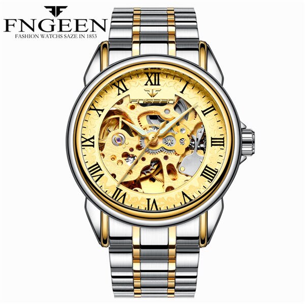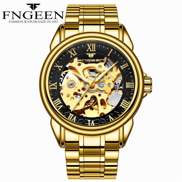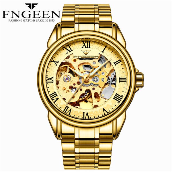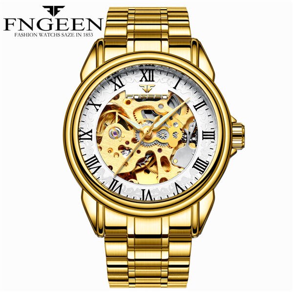FNGEEN Men Luxury Skeleton Automatic Winding Mechanical Watches Gold Stainless Steel Waterproof Wristwatch Male Time hours 8866G